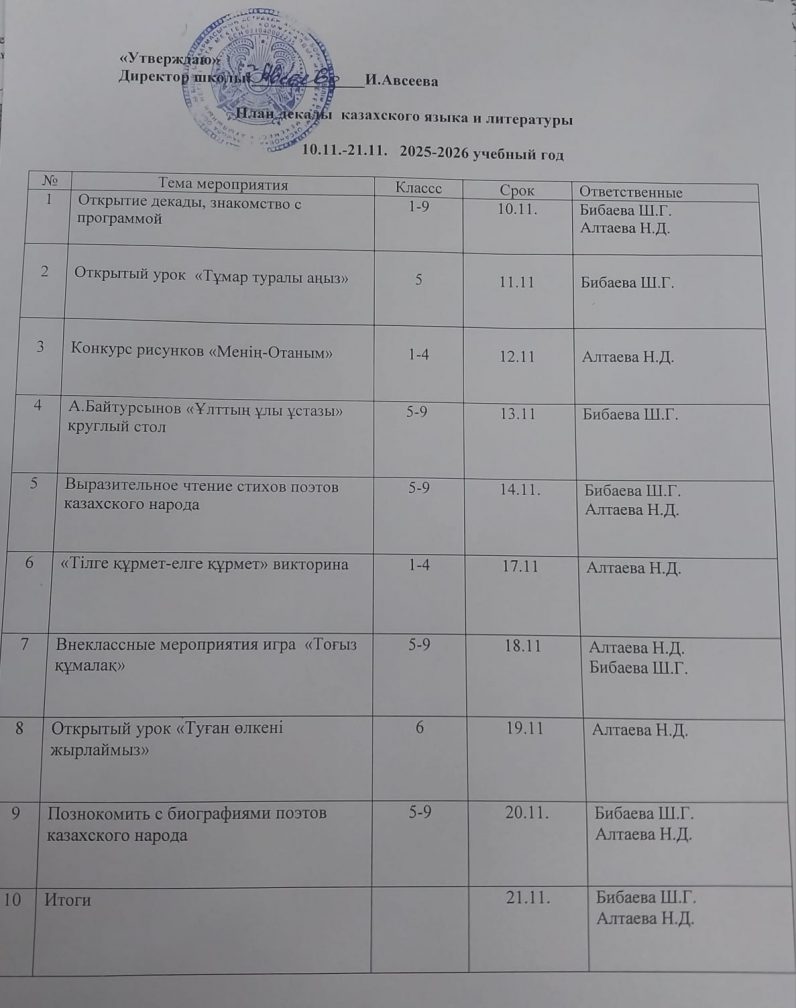 2025 жылғы 10 қарашадан бастап «Оксановка ауылының негізгі орта мектебі» КММ қазақ тілі мен әдебиеті апталығы басталды. Пән мұғалімдері осы апталықты өткізуге арналған жұмыс жоспарын жасады.