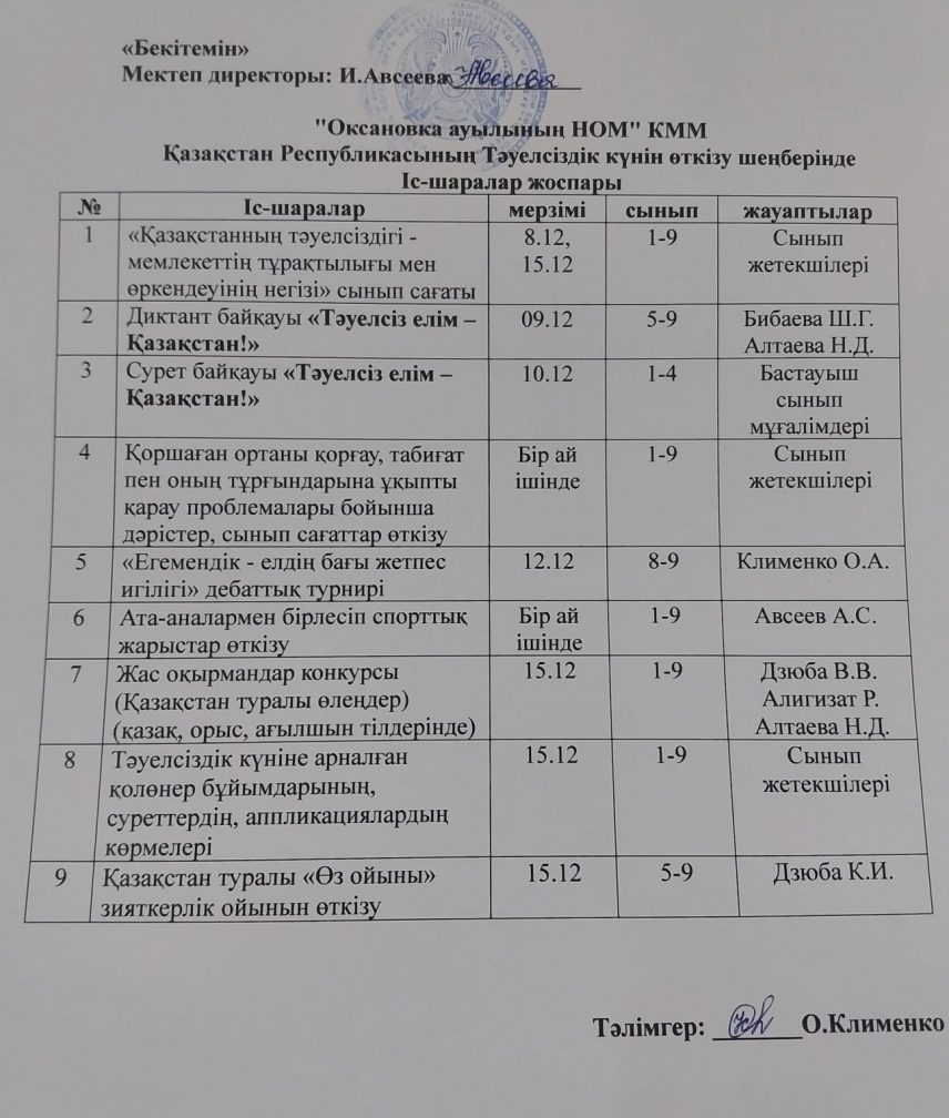Қазақстан Республикасының Тәуелсіздік күні қарсаңында О.А. Клименко мектебінің тәлімгері іс-шаралар жоспарын құрастырды. Бұл жоспар түрлі жұмыс түрлерін қамтыды: сынып сағаты, диктанттар байқаулар, суреттер байқауы, пікірсайыс турнирі, спорттық жарыстар, жас оқырмандар байқауы, зияткерлік ойындар.