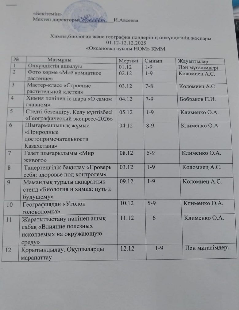 1-12 желтоқсан аралығында химия, биология, география онкүндігі басталды. Пән мұғалімдері жұмыс жоспарын жасады. Аталған жоспарға "Менің бөлмелі өсімдігім" фотокөрмесі, "Өсімдік торының құрылысы" шеберлік сыныбы, "Ең бастысы туралы" химия іс-шарасы, "Бас табыштың бұрышы" стендін қалыптастыру, "Тірі әлем" қабырға газетін шығару, ақпараттық стенд, оқушылардың шығармашылық жұмысы, 6-сыныпта жаратылыстану пәнінің ашық сабағы өтеді тақырыбы: "Пайдалы қазбалардың қоршаған ортаға әсері ".